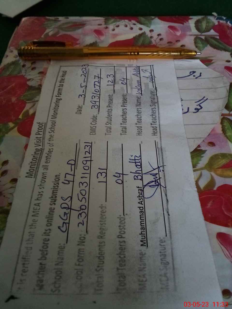 | Attendance Register | Head Teacher | MEA with School | Visit Proof |