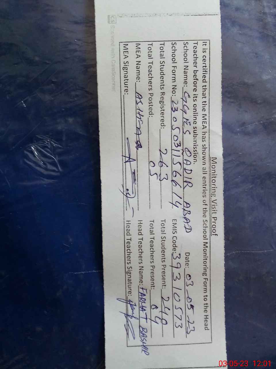 | Attendance Register | Head Teacher | MEA with School | Visit Proof |