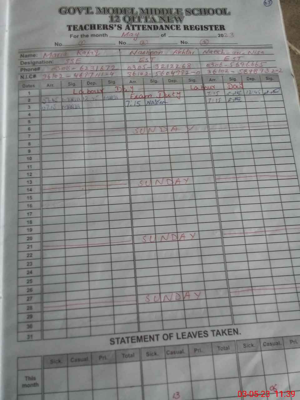 | CNIC | Full Name | Designation | R/C | Absence During Last Calender Month |