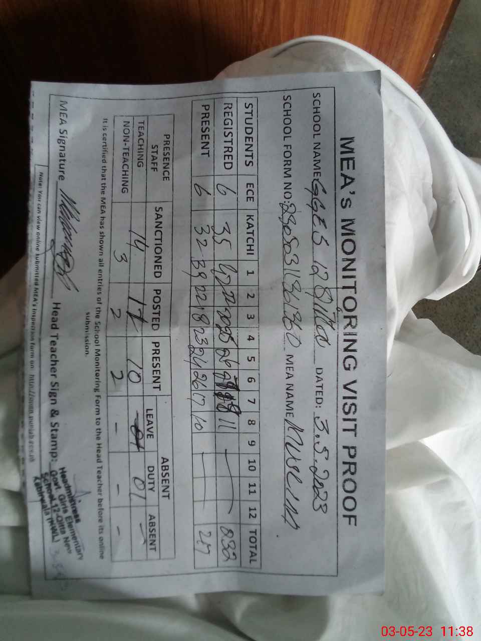 | Attendance Register | Head Teacher | MEA with School | Visit Proof |