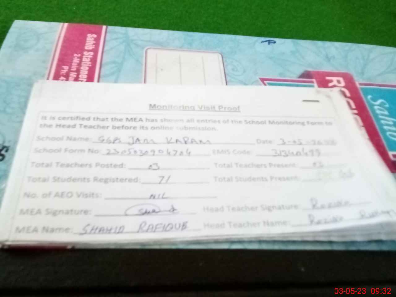 | Attendance Register | Head Teacher | MEA with School | Visit Proof |