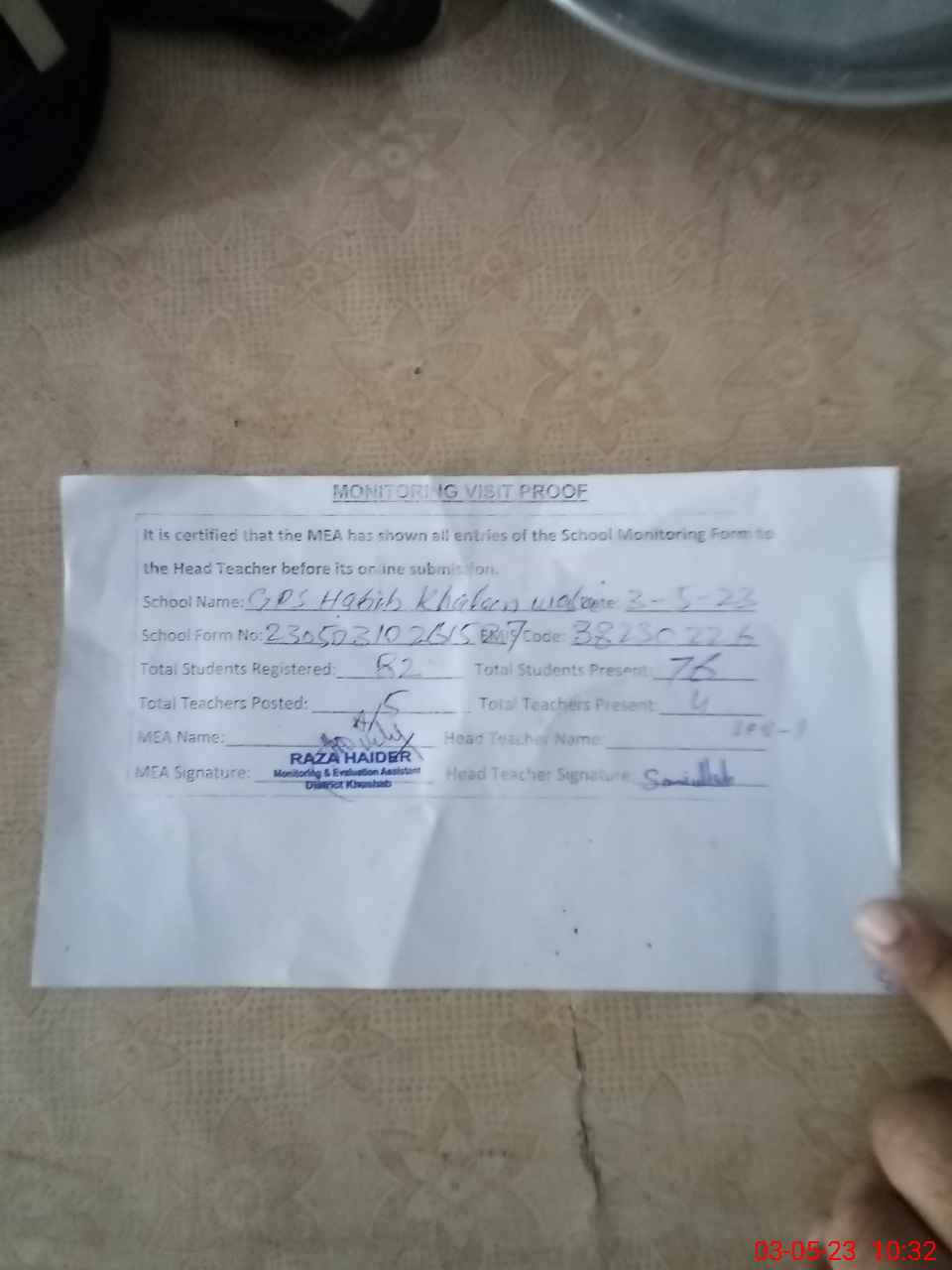 | EMIS Code: 38230226 | Name of School: GPS HABIB KHAILAN WALA | |||