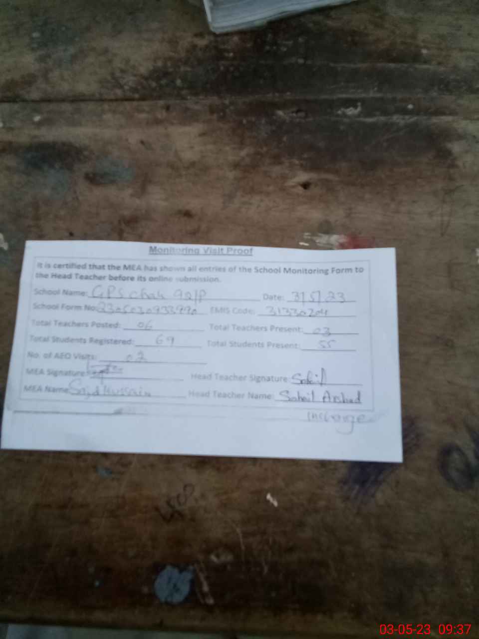 | Attendance Register | Head Teacher | MEA with School | Visit Proof |
