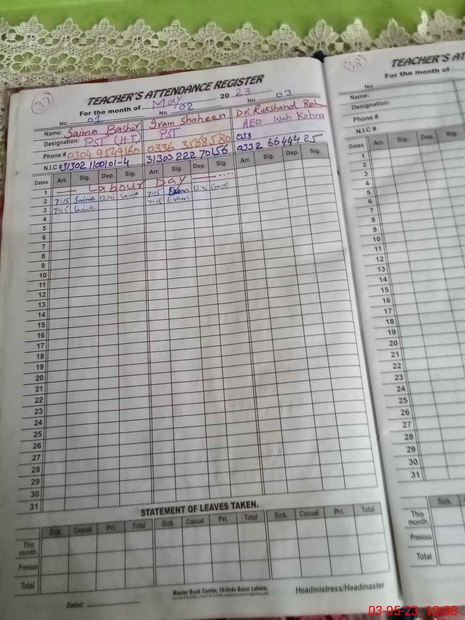 | Name: Sa**** Ba**** Designation: (School Headmaster's/Headmistress's) PST Phone/Cell Number: 03**** |