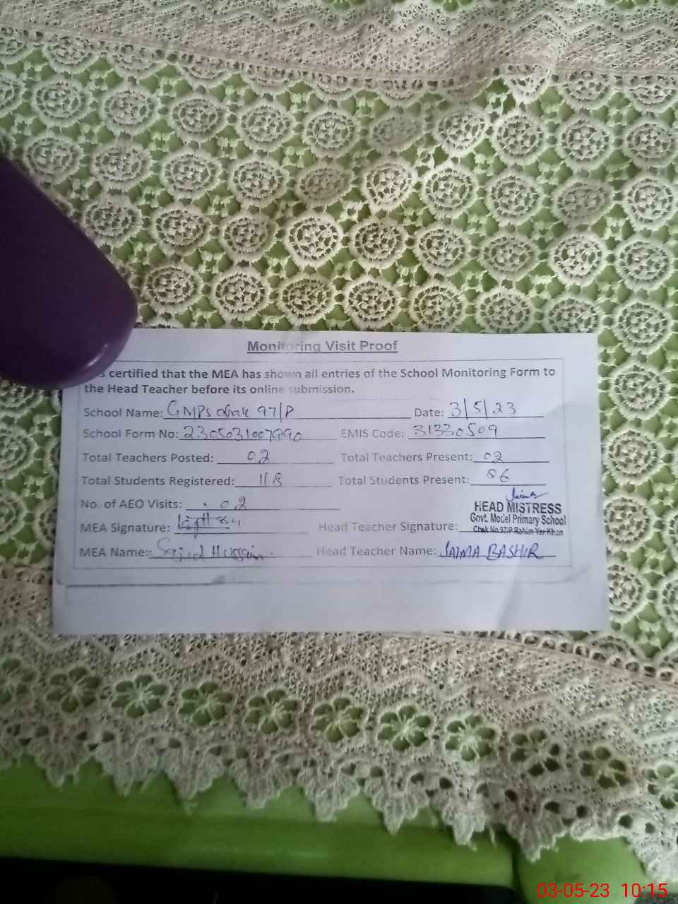 | Monitoring Date: 03-05-2023 | Start Time: 03-05-2023 09:50 AM | End Time: 03-05-2023 10:15 AM | Name of MEA: Sa**** Hu**** | |