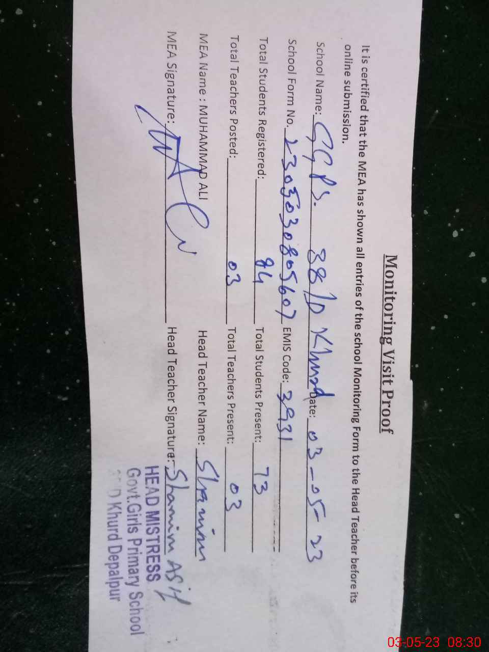 | Certified that this School was Inspected by the Undersigned MEA/DMO Today and the Information Stated Above is as Per Record. | |||||
