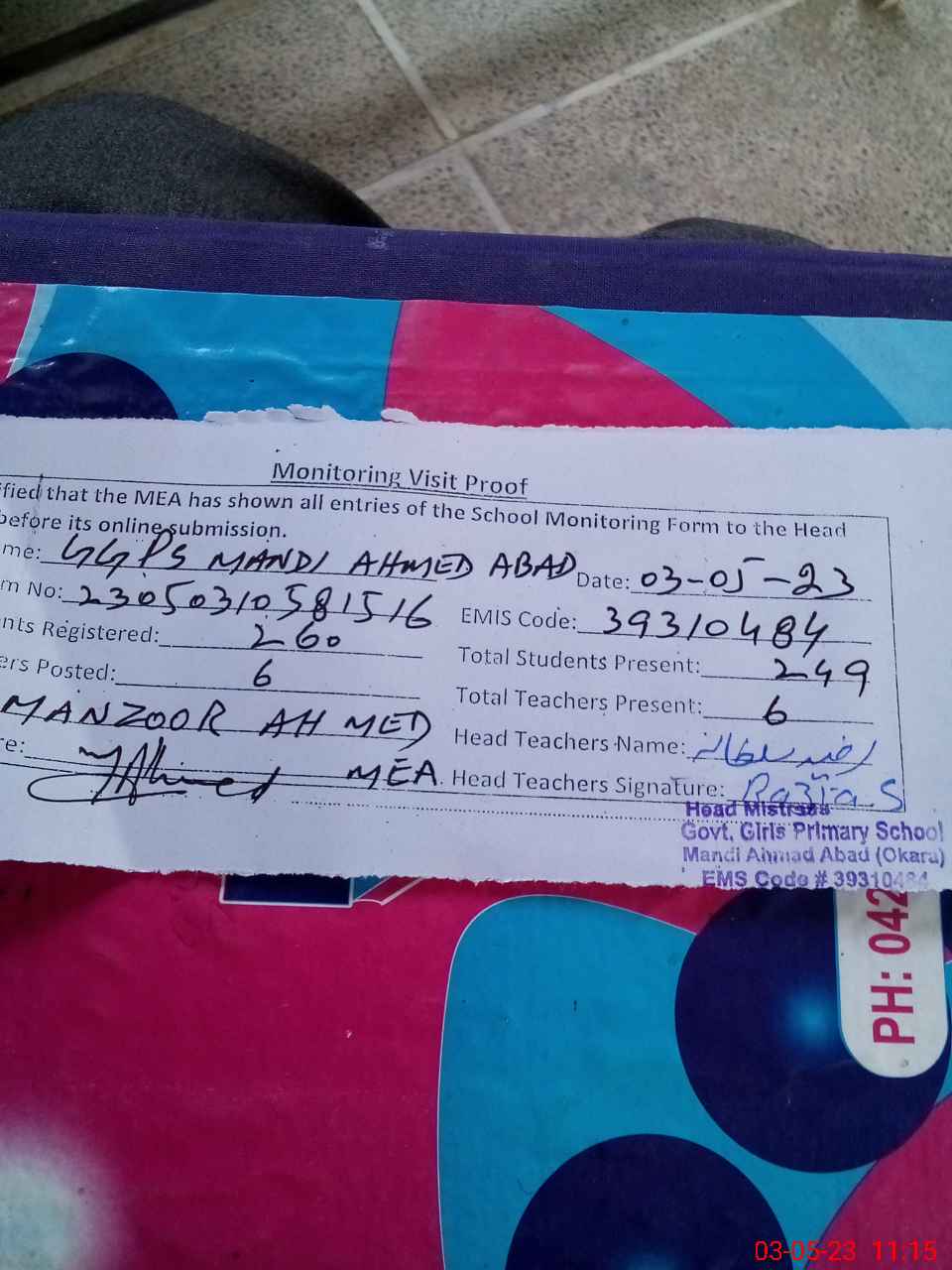 | EMIS Code: 39310484 | Name of School: GGPS MANDI AHMED ABAD | |||