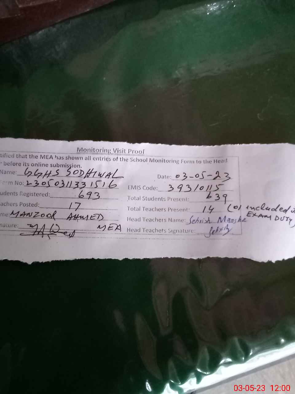 | EMIS Code: 39310115 | Name of School: GGHS SODHIWAL | |||