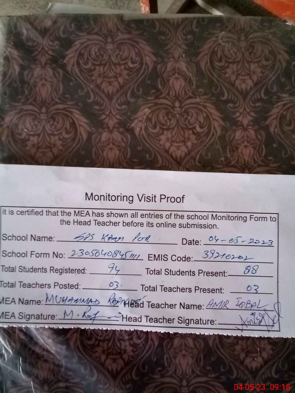 | Attendance Register | Head Teacher | MEA with School | Visit Proof |