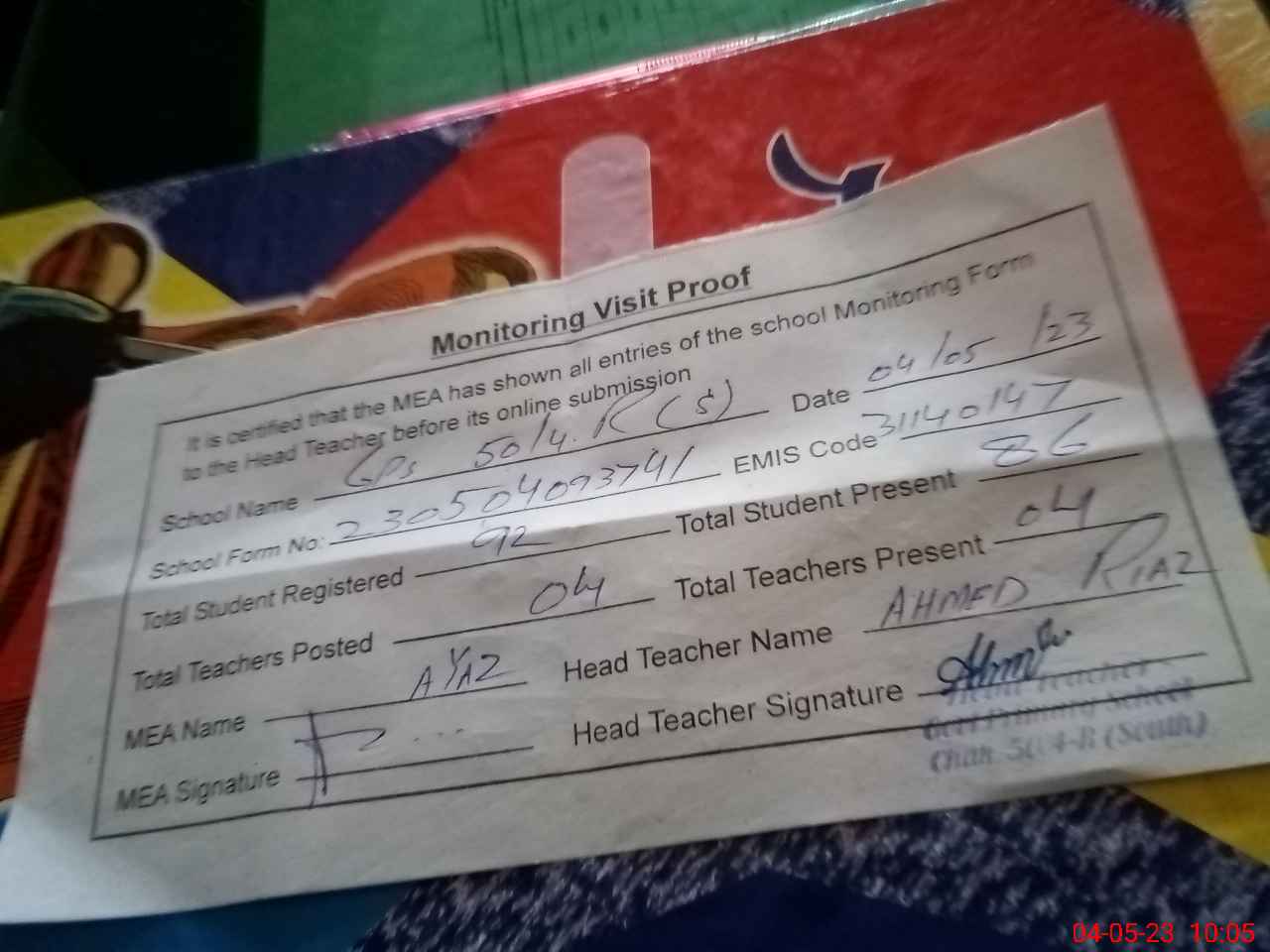 | Attendance Register | Head Teacher | MEA with School | Visit Proof |