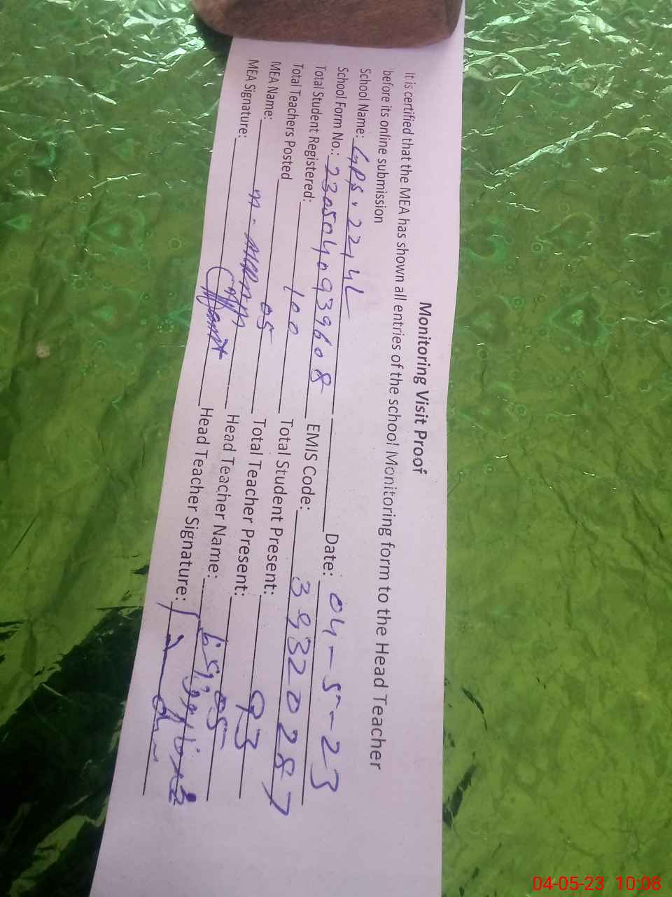 | Attendance Register | Head Teacher | MEA with School | Visit Proof |