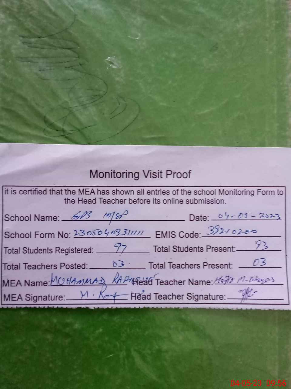| Attendance Register | Head Teacher | MEA with School | Visit Proof |