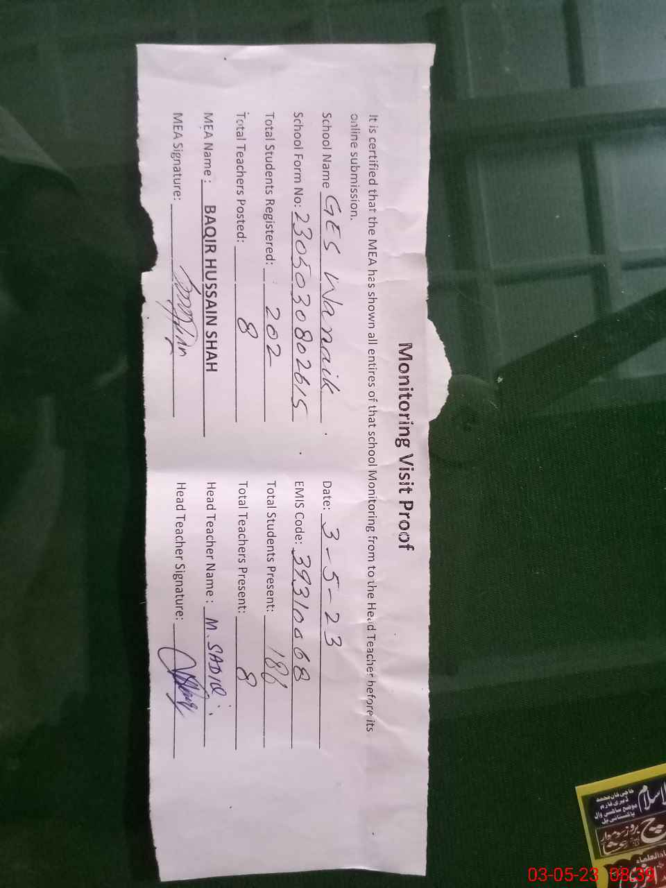 | Attendance Register | Head Teacher | MEA with School | Visit Proof |