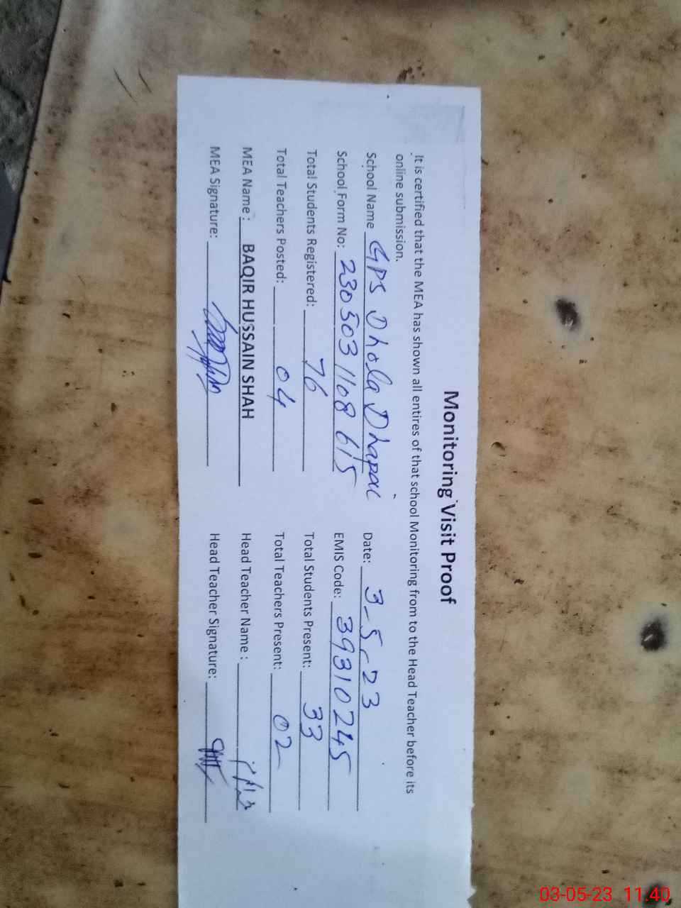 | Attendance Register | Head Teacher | MEA with School | Visit Proof |