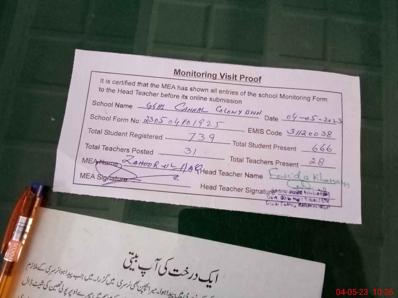 | Attendance Register | Head Teacher | MEA with School | Visit Proof |