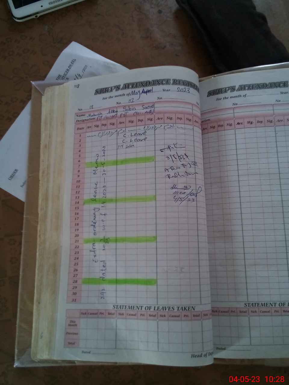 | Leave | Duty | Absent | Maternity | Medical | Ex- Pak |