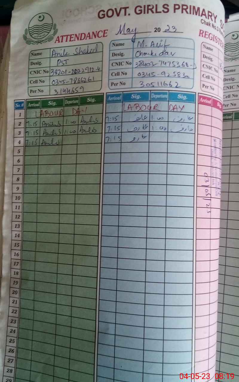| CNIC | Full Name | Designation | R/C | Absence During Last Calender Month |
