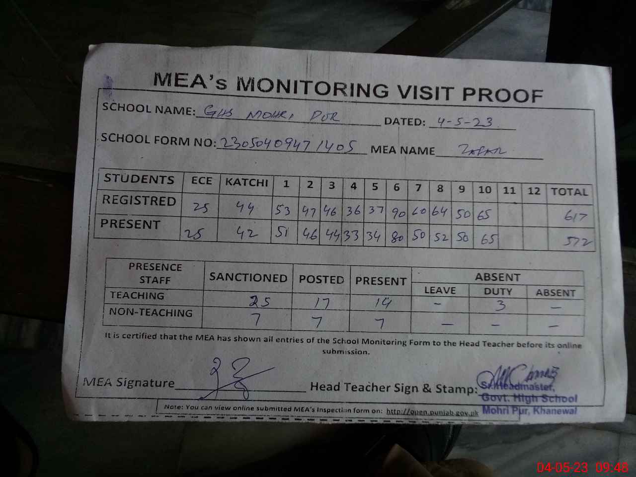 | Attendance Register | Head Teacher | MEA with School | Visit Proof |