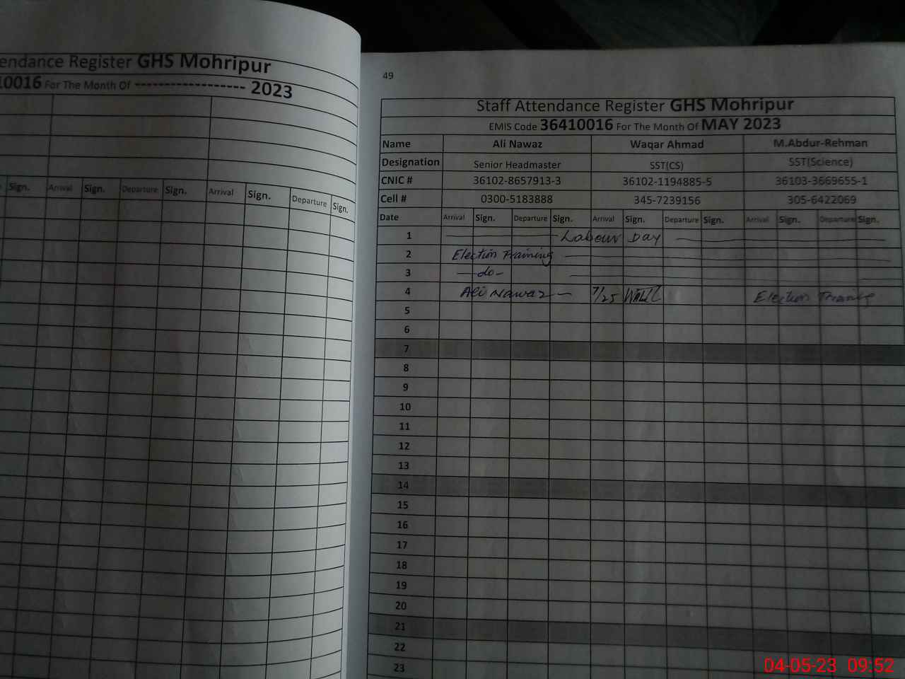| CNIC | Full Name | Designation | R/C | Absence during last cal. month |
