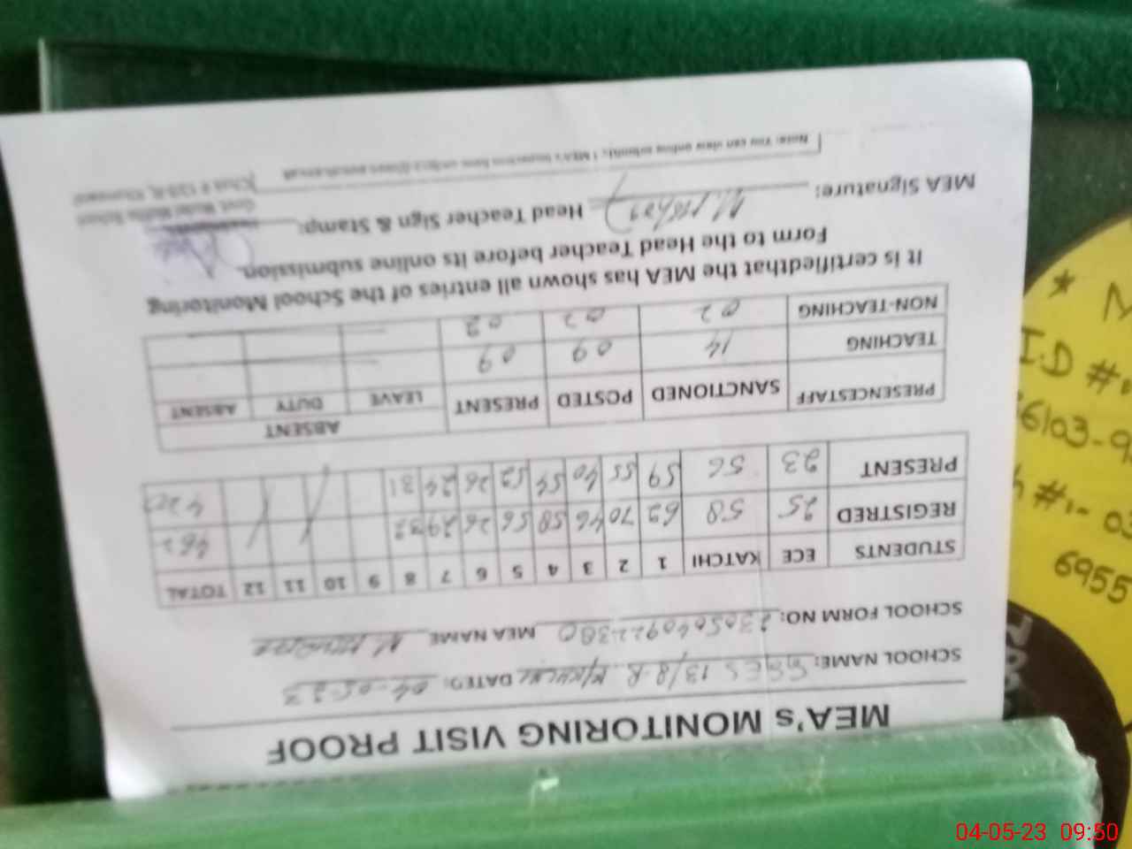 | Attendance Register | Head Teacher | MEA with School | Visit Proof |