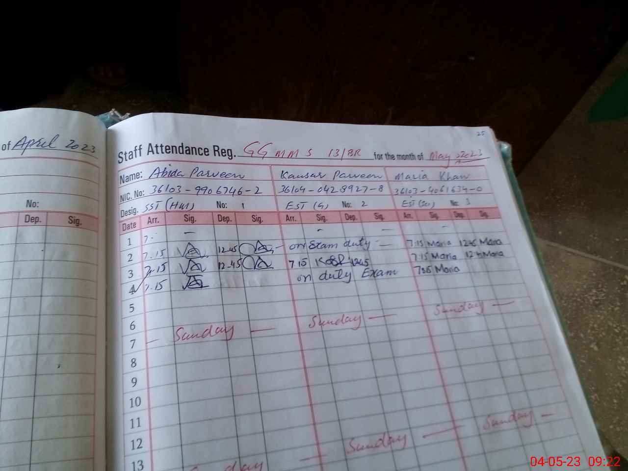 | CNIC | Full Name | Designation | R/C | Absence During Last Calender Month |
