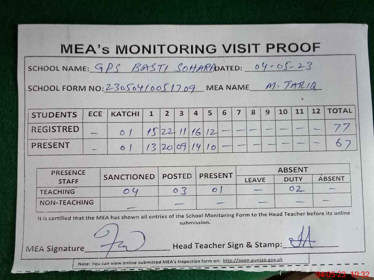 | Attendance Register | Head Teacher | MEA with School | Visit Proof |