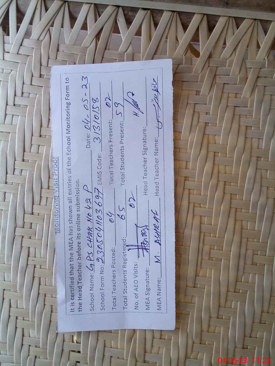 | Attendance Register | Head Teacher | MEA with School | Visit Proof |