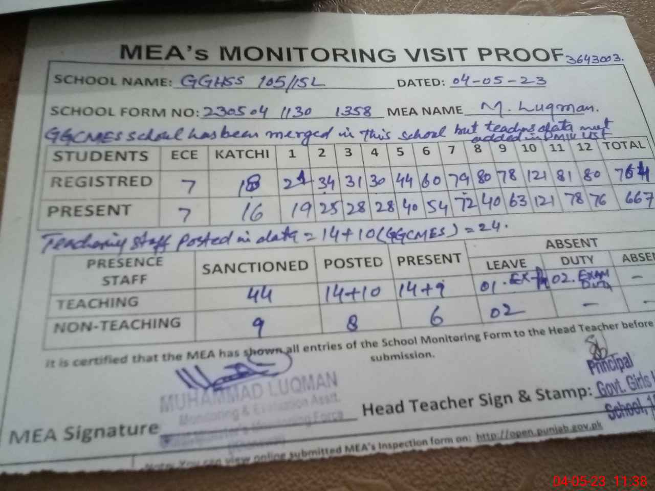 | EMIS Code: 36430003 | Name of School: GGHSS 105/15-L VANJARI, MIAN CHANNU | |||