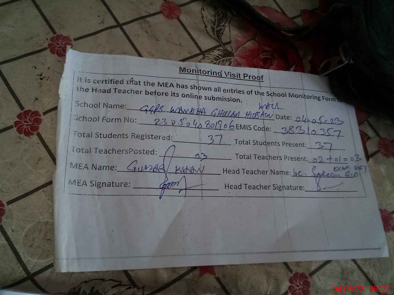 | Attendance Register | Head Teacher | MEA with School | Visit Proof |
