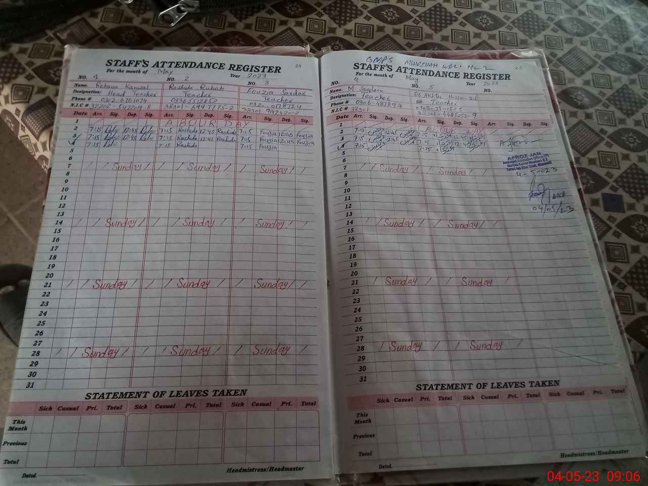 | CNIC | Full Name | Designation | R/C | Absence During Last Calender Month |