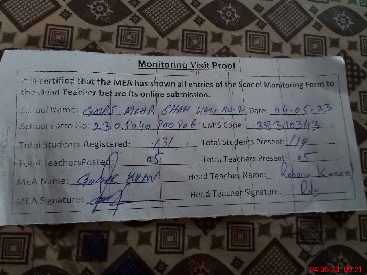| Attendance Register | Head Teacher | MEA with School | Visit Proof |