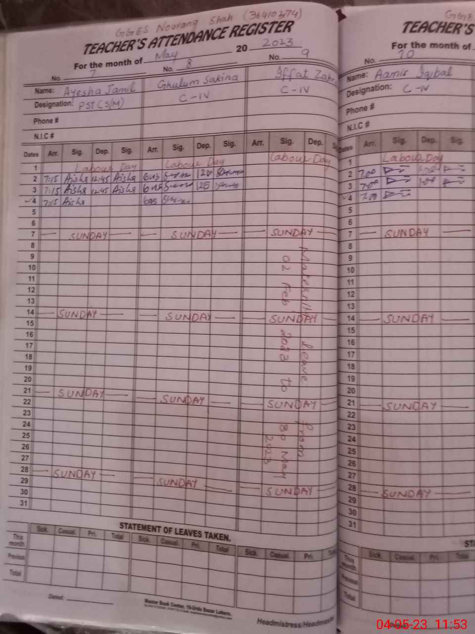 | CNIC | Full Name | Designation | R/C | Absence During Last Calender Month |