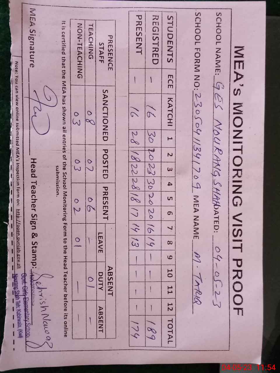 | Attendance Register | Head Teacher | MEA with School | Visit Proof |