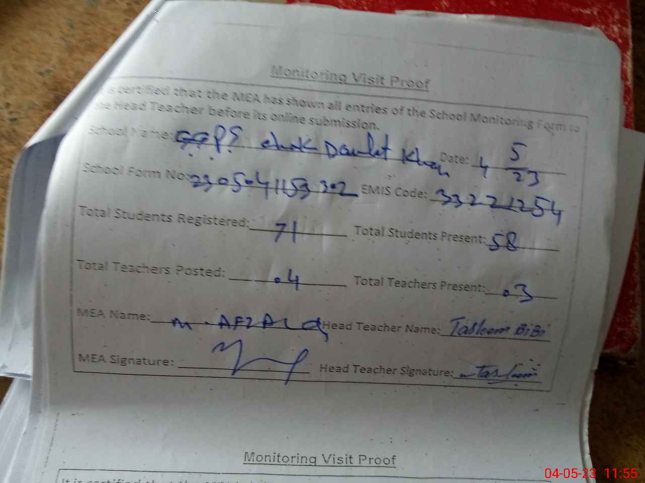| Attendance Register | Head Teacher | MEA with School | Visit Proof |