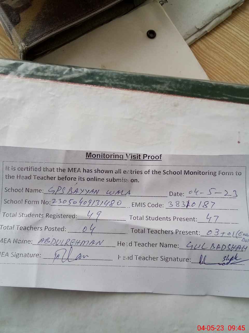 | Attendance Register | Head Teacher | MEA with School | Visit Proof |