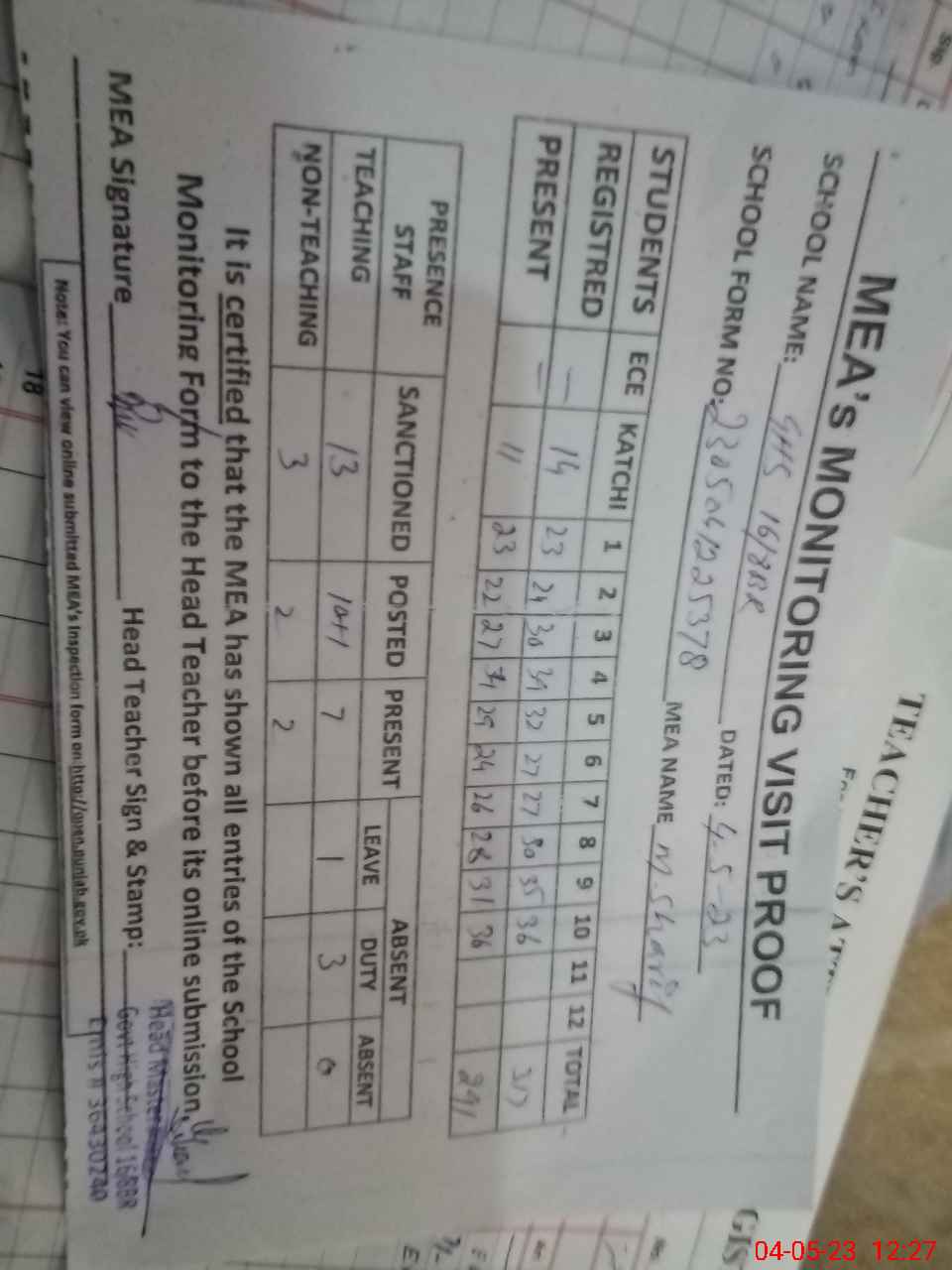 | Attendance Register | Head Teacher | MEA with School | Visit Proof |