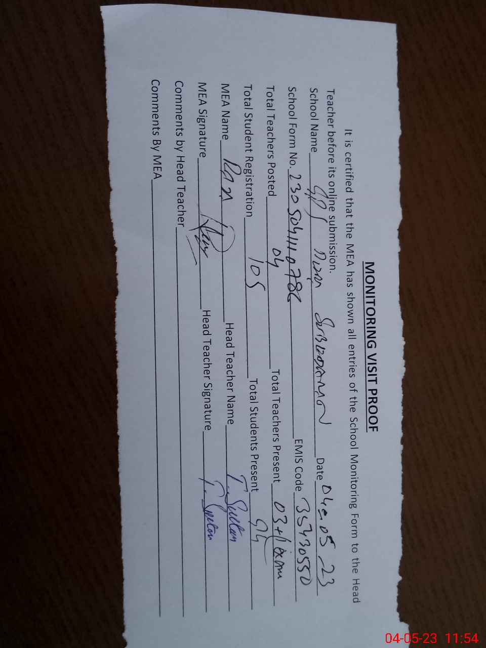 | Attendance Register | Head Teacher | MEA with School | Visit Proof |