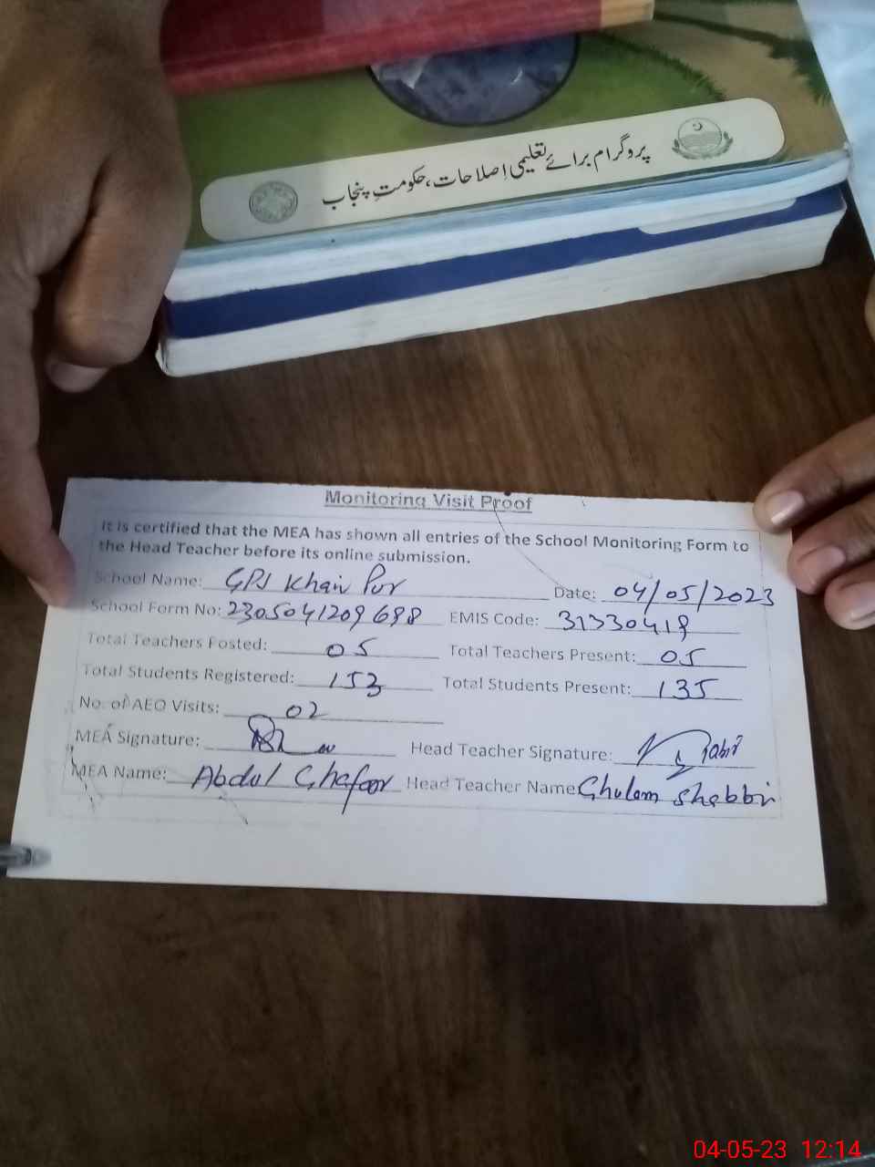 | Attendance Register | Head Teacher | MEA with School | Visit Proof |