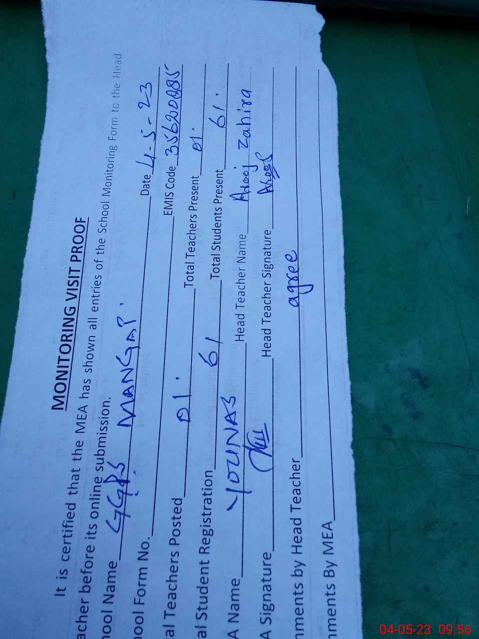| Attendance Register | Head Teacher | MEA with School | Visit Proof |
