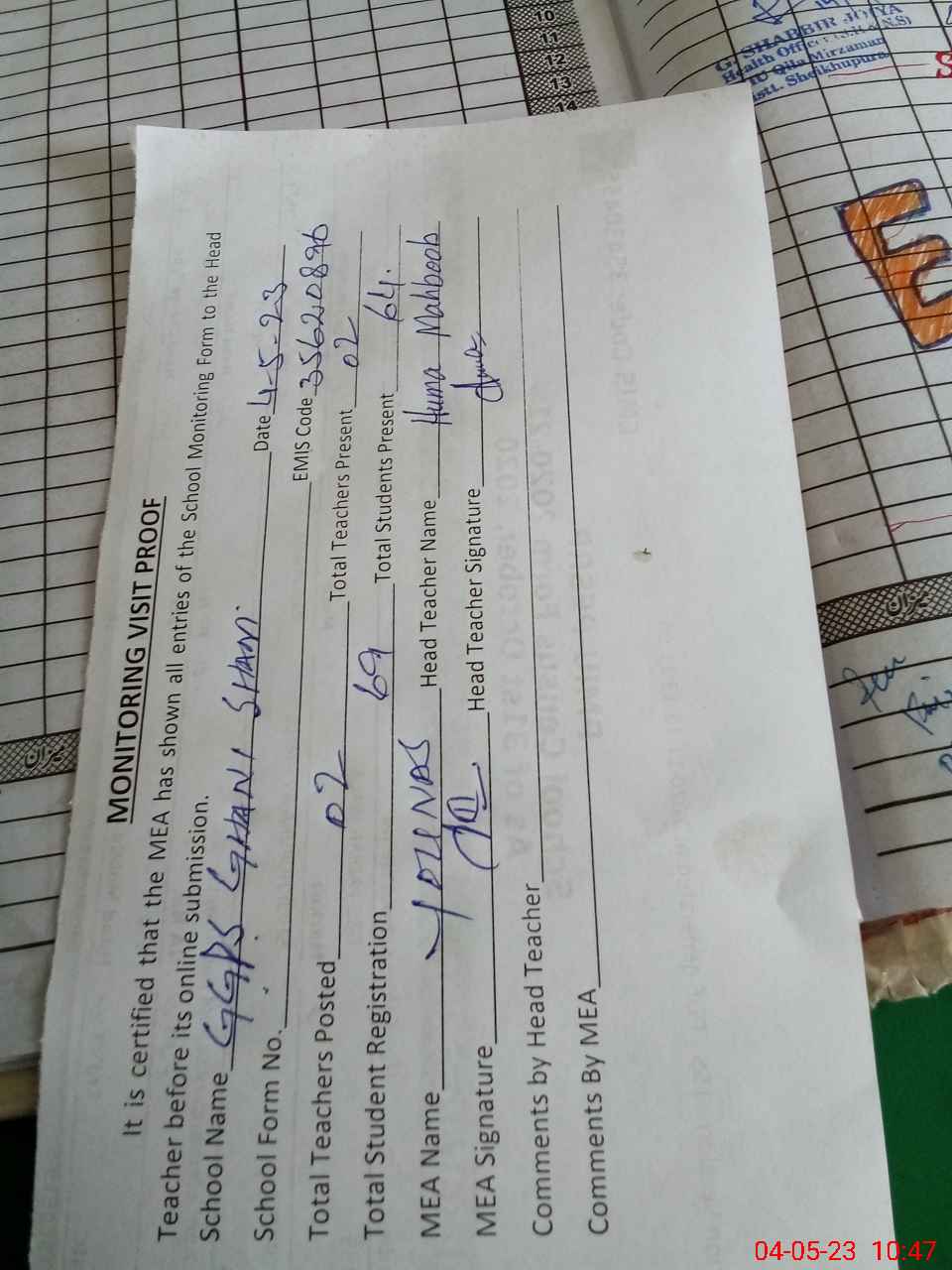 | Attendance Register | Head Teacher | MEA with School | Visit Proof |