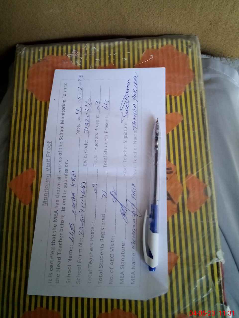 | Attendance Register | Head Teacher | MEA with School | Visit Proof |