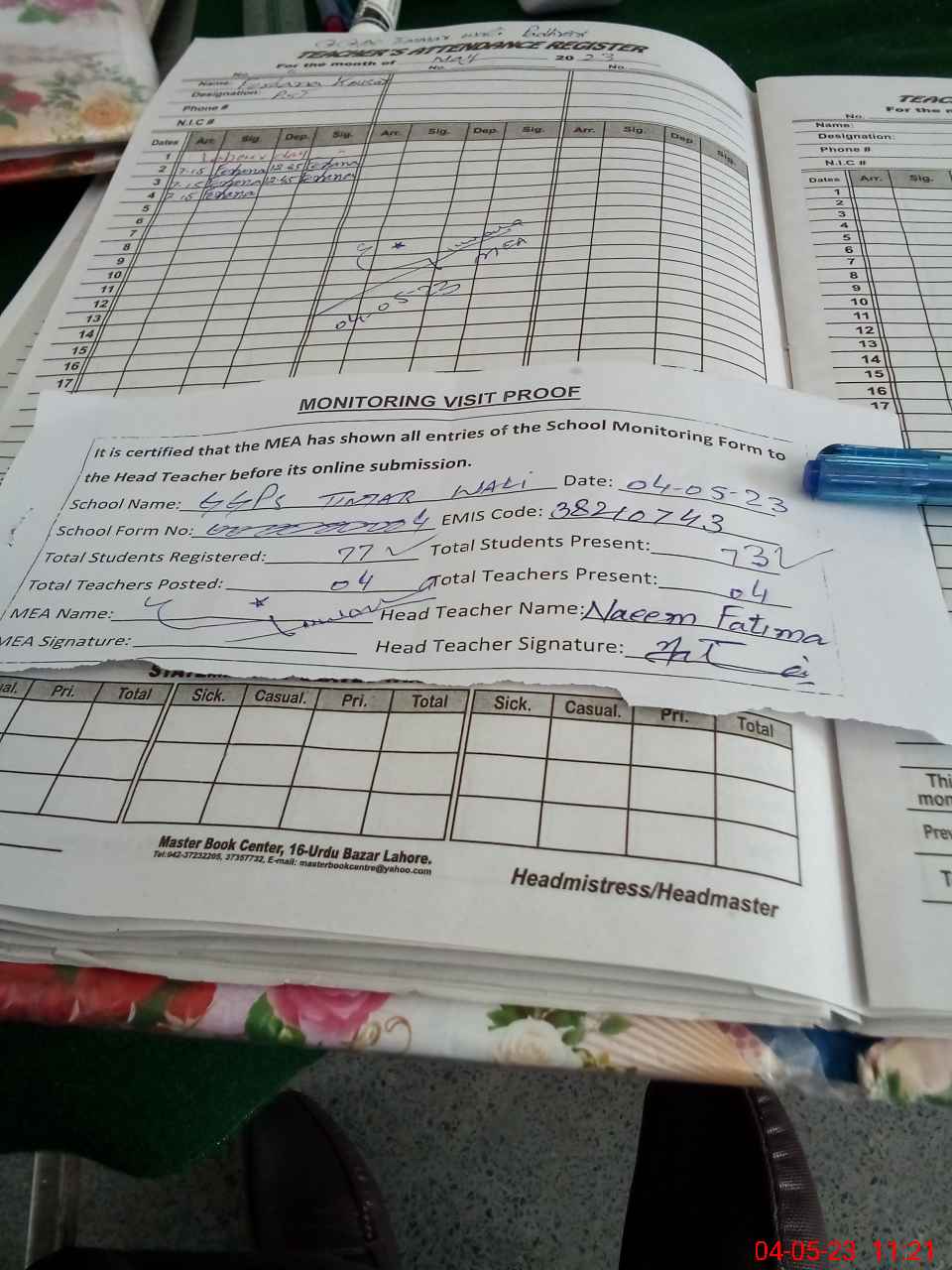 | Attendance Register | Head Teacher | MEA with School | Visit Proof |