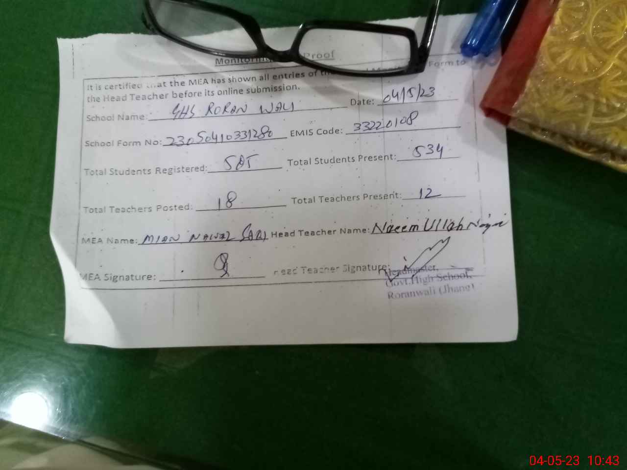| Attendance Register | Head Teacher | MEA with School | Visit Proof |
