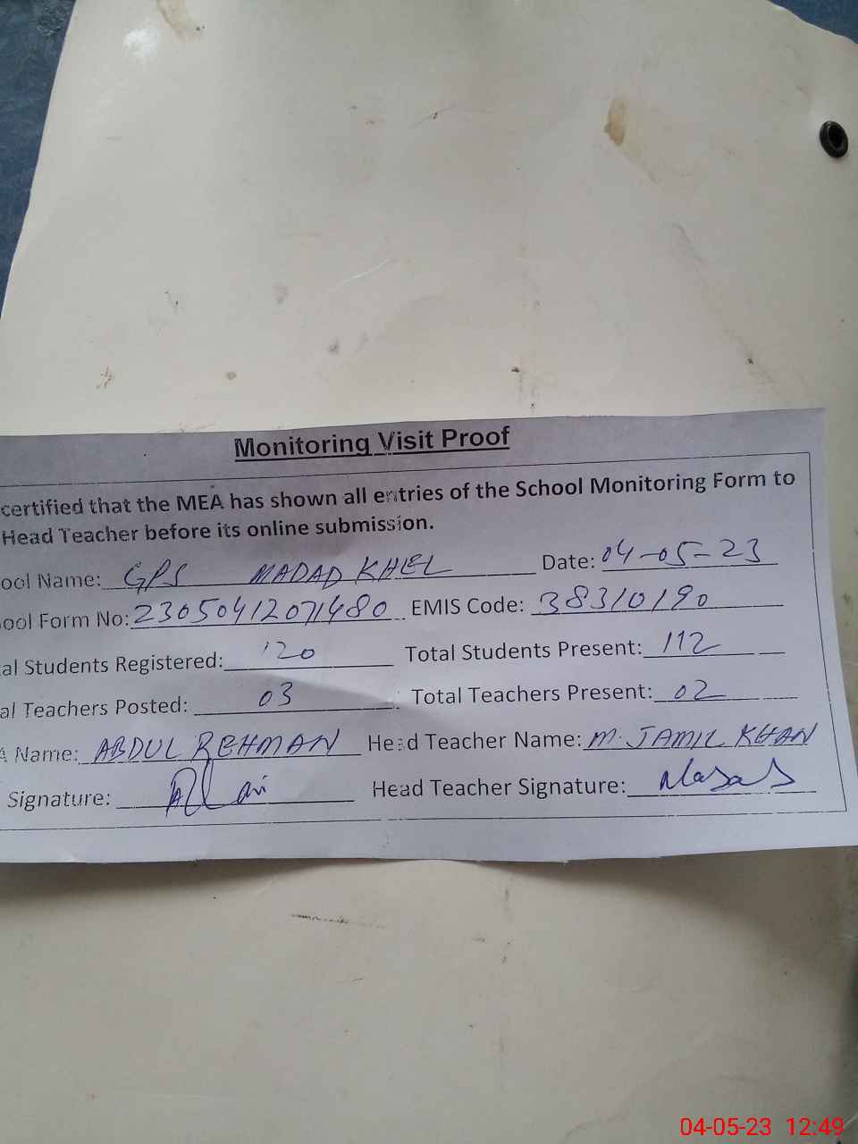 | Attendance Register | Head Teacher | MEA with School | Visit Proof |