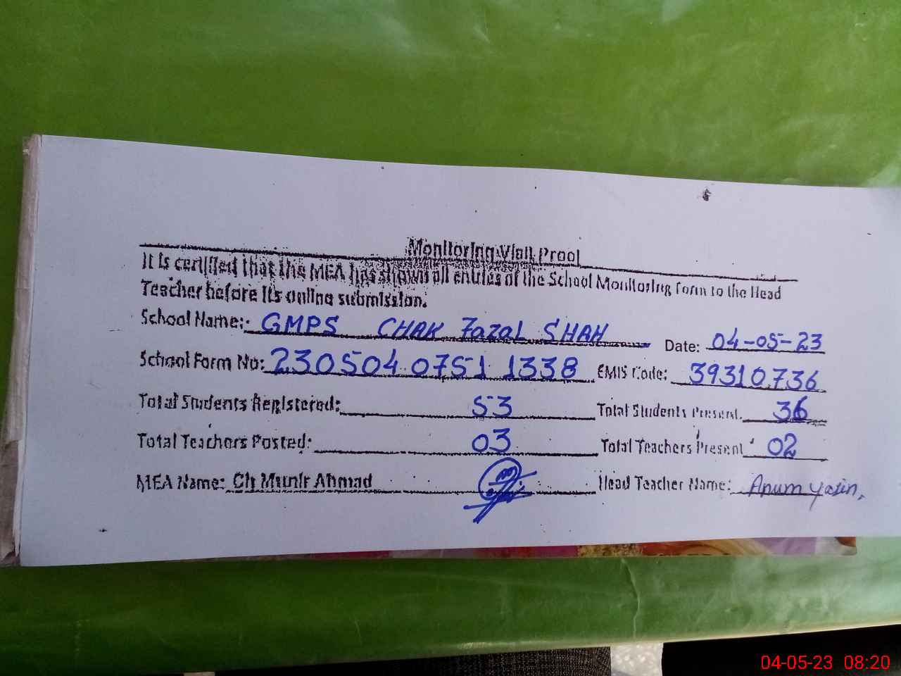 | EMIS Code: 39310736 | Name of School: GMPS CHAK FAZAL SHAH | |||