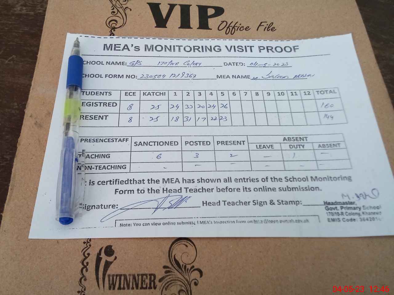 | Attendance Register | Head Teacher | MEA with School | Visit Proof |