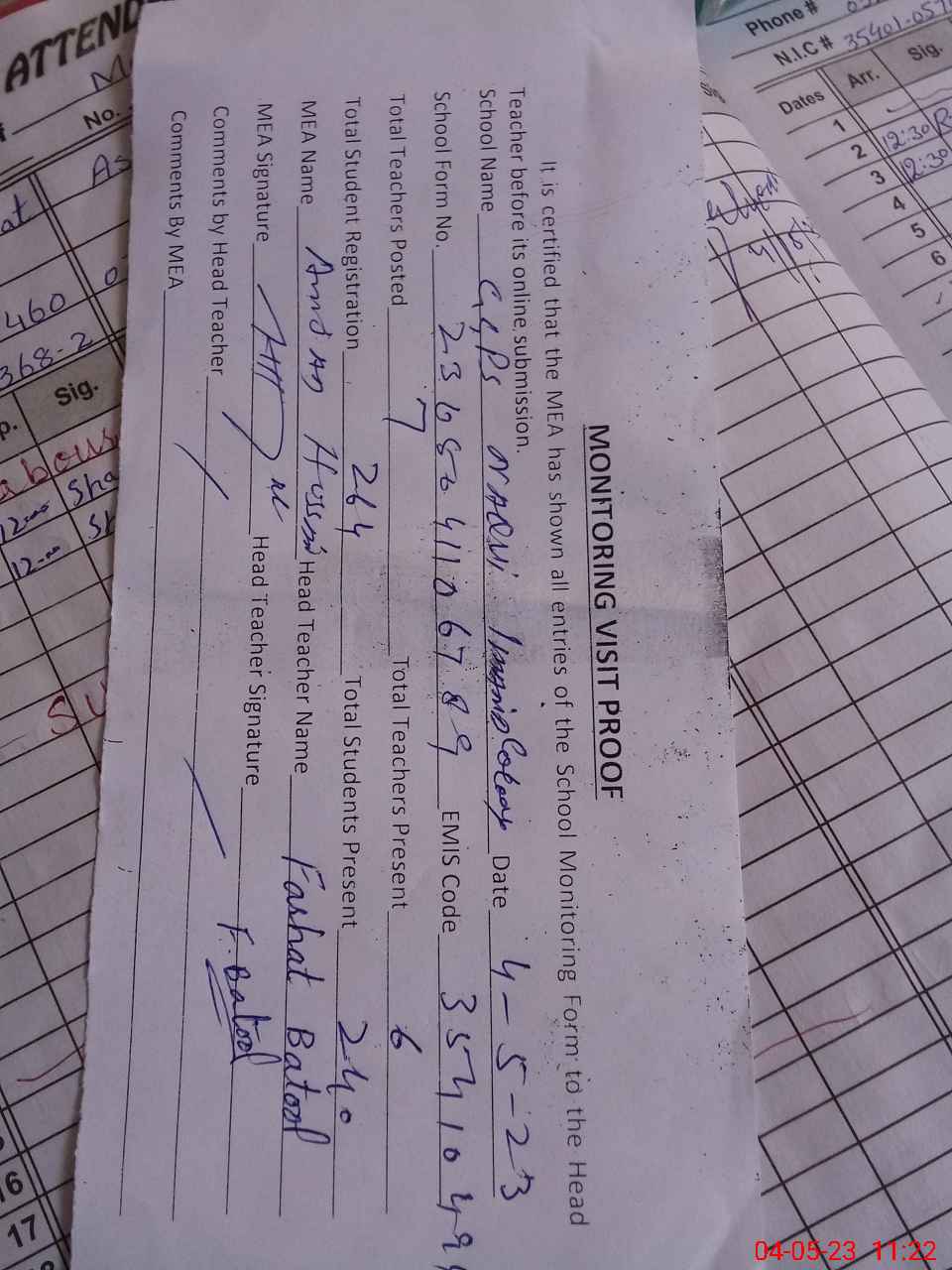 | Attendance Register | Head Teacher | MEA with School | Visit Proof |