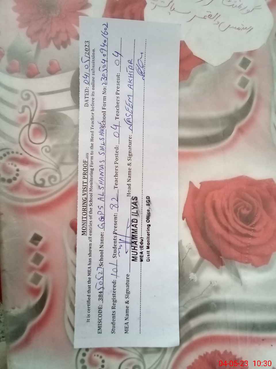 | EMIS Code: 38450527 | Name of School: GGPS AL-SHAMAS-UL-QAMAR (NEW NAME) | |||
