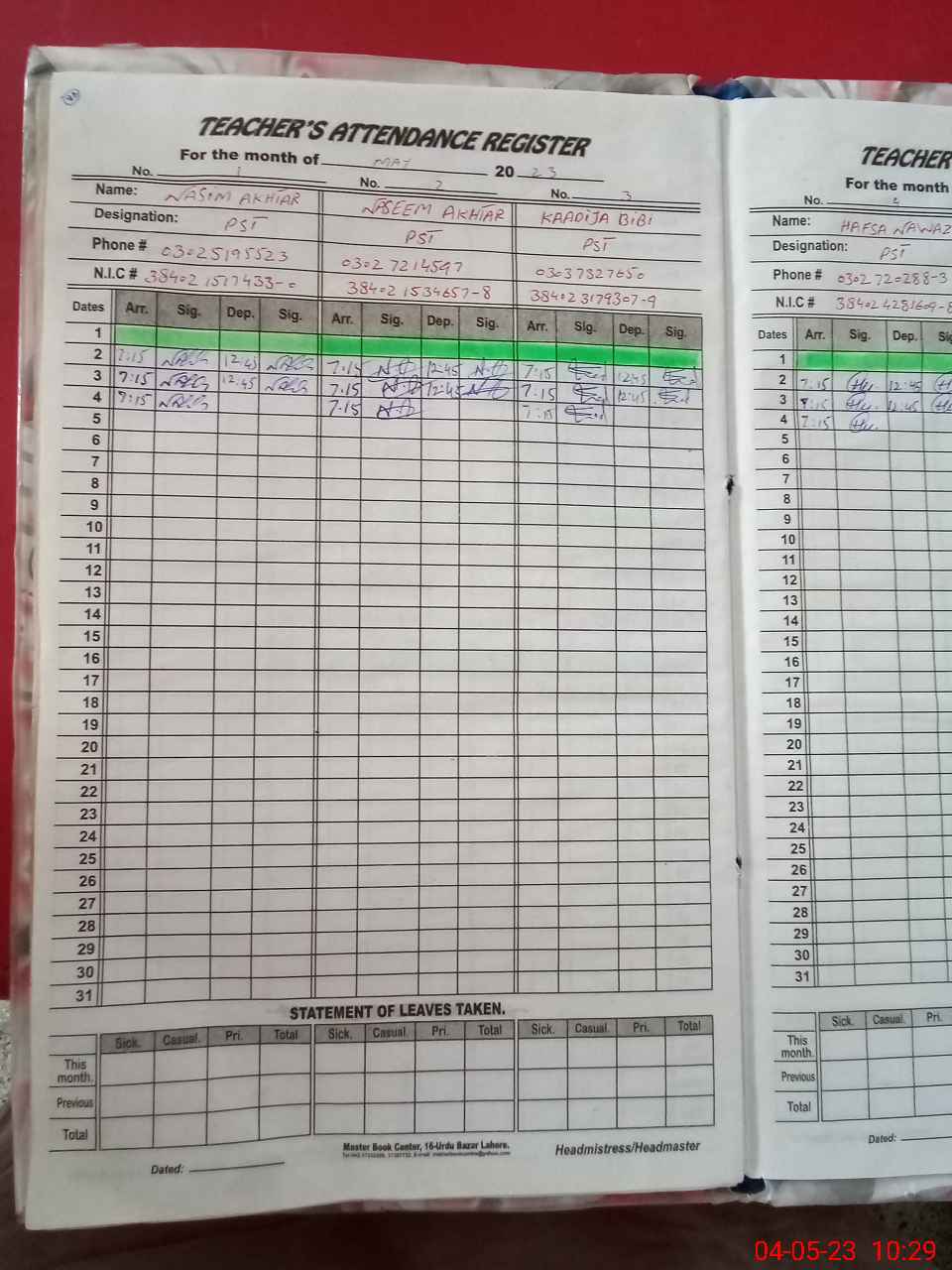 | CNIC | Full Name | Designation | R/C | Absence During Last Calender Month |