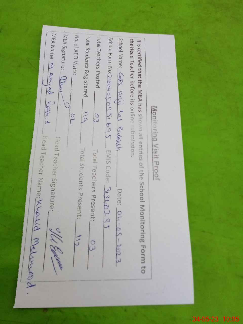 | Attendance Register | Head Teacher | MEA with School | Visit Proof |